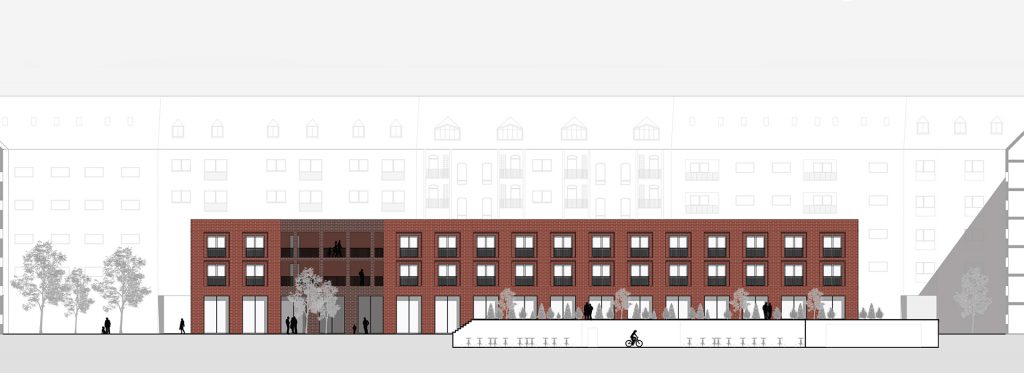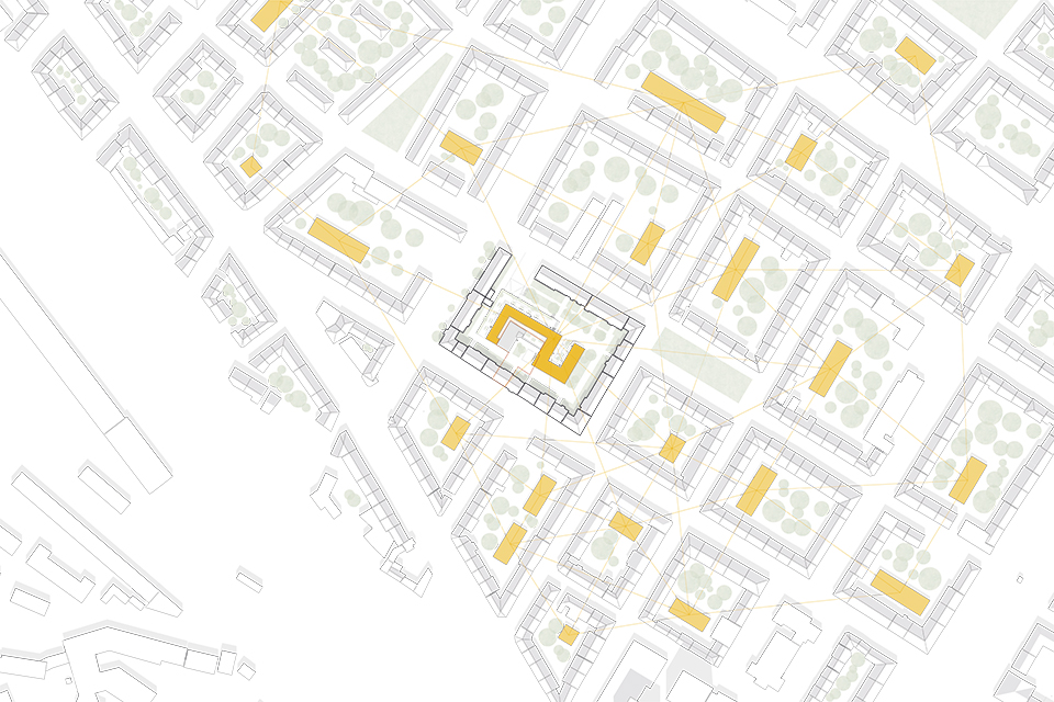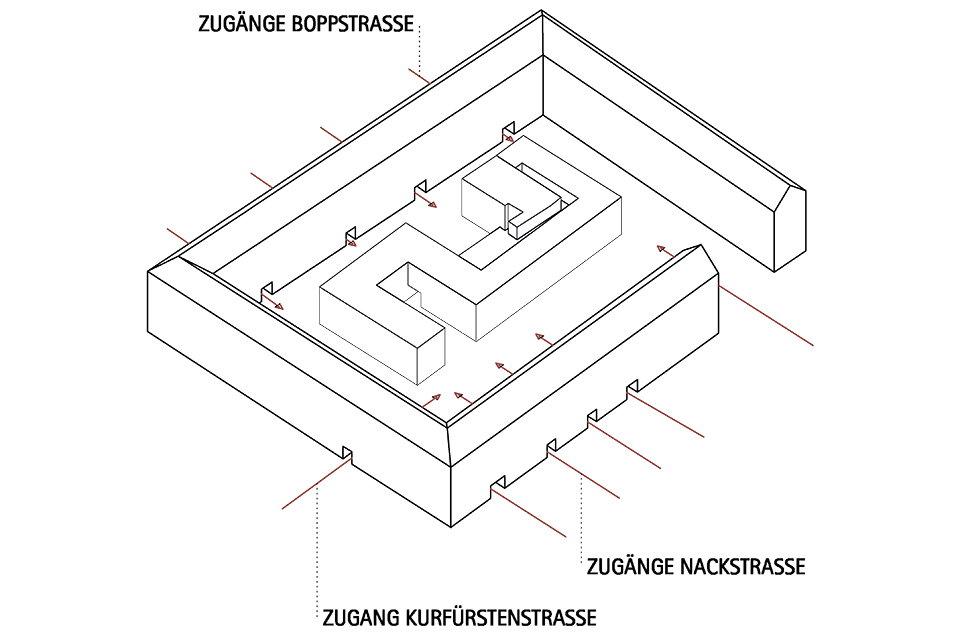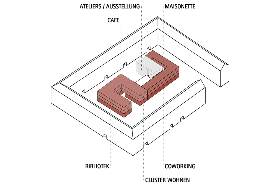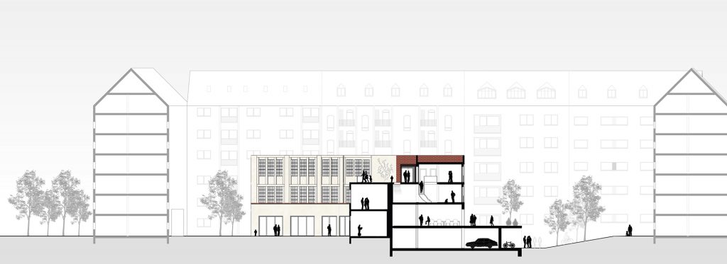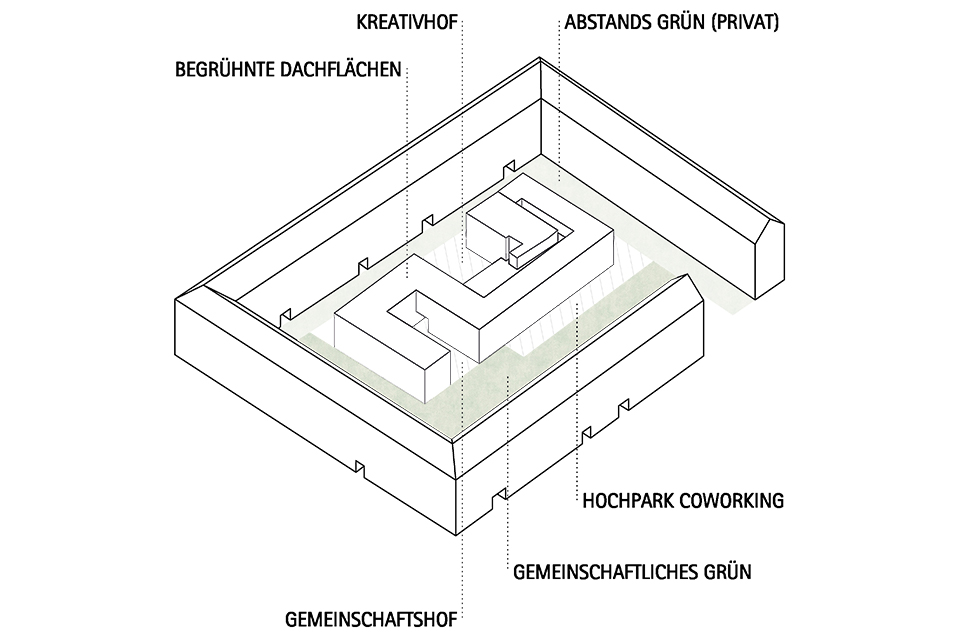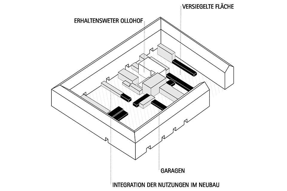 Deutschen Metropolen fehlt Wohnraum und die Bekämpfung des „Platzproblems“ wird in vielen deutschen Städten zur Herausforderung. Dies zeigt sich auch in der rheinland-pfälzischen Landeshauptstadt Mainz. Die Verteuerung des Wohnens beschleunigt weiter Phänomene der Gentrifizierung und verändert damit zugleich den Charakter dieser Wohnquartiere, ihre ursprüngliche soziale Durchmischung und ihre spezifischen Atmosphären. Maßnahmen der Innenentwicklung bzw. Nachverdichtung erschließen bislang mindergenutzte Blockinnenbereiche zentrumsnaher Wohnquartiere und schaffen Potenziale für neue Wohnformen. An diesen Orten sind häufig Überreste ehemaliger Industriegebäude oder kleinteilige Bebauung unterschiedlichster Nutzungen vorzufinden. Zudem ist ein Großteil der damit verbundenen Flächen versiegelt. Für die Boppstraße 42 in der Mainzer Neustadt und die dortige Blockrandbebauung sollte ein exemplarischer Lösungsansatz entwickelt werden. Das historische Gebäude des Ollohofs galt es in dieses Konzept zu integrieren. Für die Mainzer Neustadt wurde daraufhin ein blockübergreifendes Konzept erarbeitet: Die vorhandenen Blockränder sollen bereinigt werden und die Nutzungen in einen neuen Baukörper umgesiedelt werden. Denn es stellte sich heraus, dass die Flächen innerhalb der Blockrandbebauung durch einen einzigen prägnanten Baukörper am besten genutzt werden können, bei gleichzeitiger Steigerung der Wohnqualität. Der Entwurf lässt zudem die Entsiegelung von Freiflächen zu und es entsteht zusätzlicher Grünraum. Durch die Bündelung der unterschiedlichen Nutzungen in den einzelnen „Hotspots“ ergibt sich ein quartierübergreifendes Netzwerk aus Funktionen, welche als Anzugspunkt für die gesamte Mainzer Neustadt fungieren und einen Austausch sowie die Interaktion miteinander fördern. Das breite Spektrum an Nutzungen bildet ein Mehrwert für die Nachbarschaft und das soziale Miteinander und fördern zudem die Durchmischung.