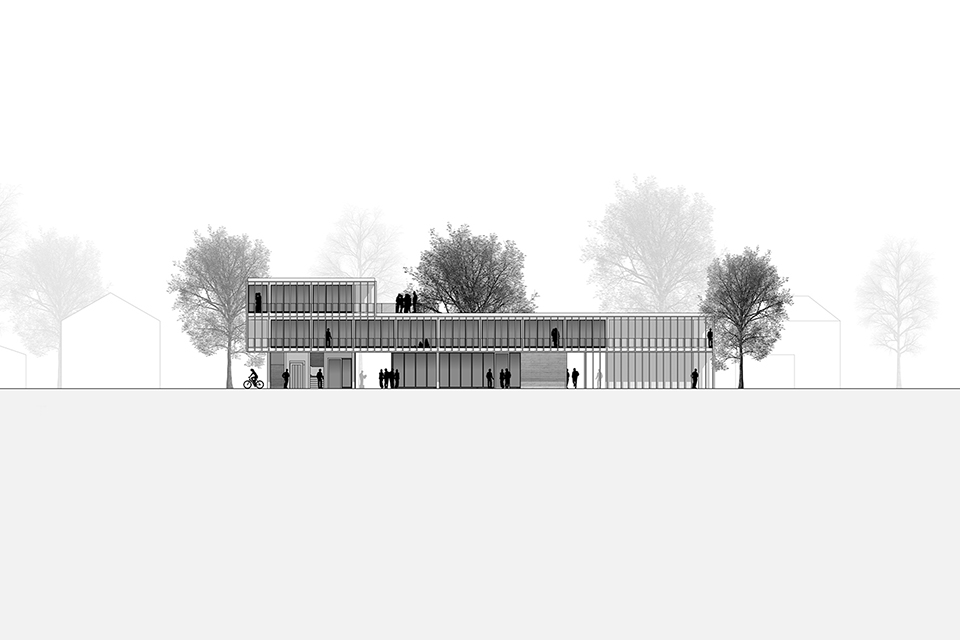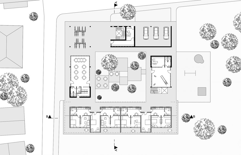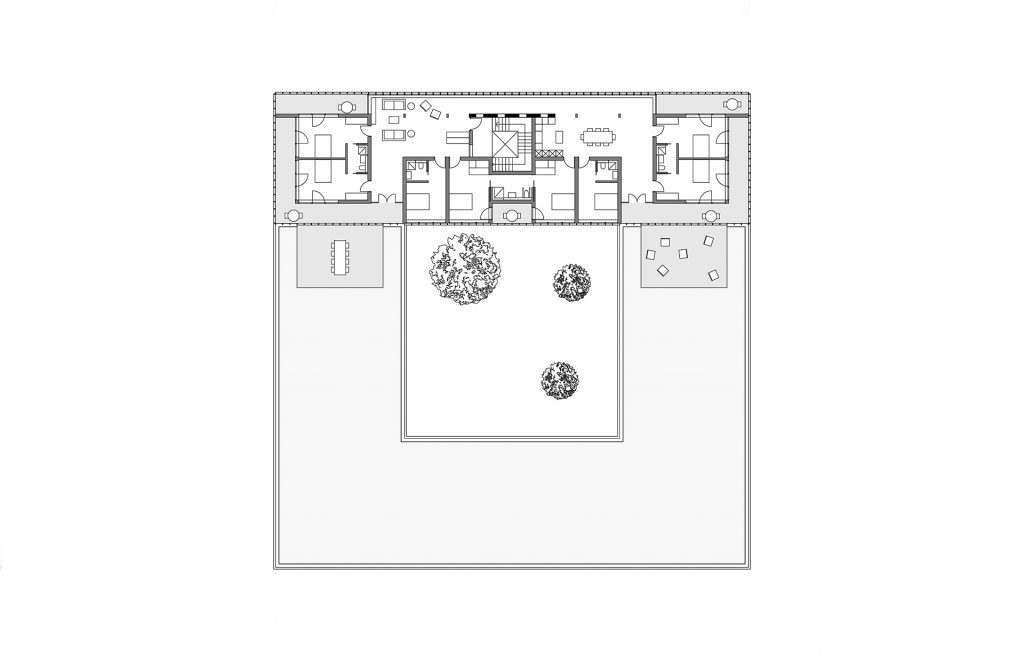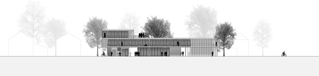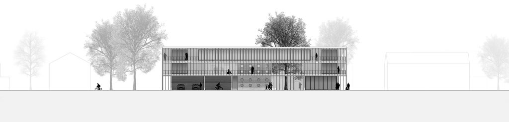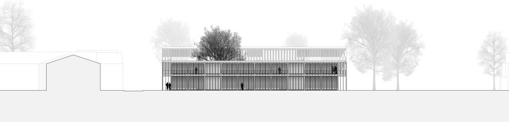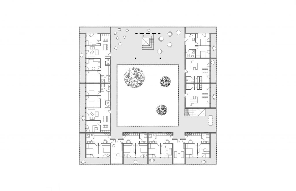 In der kleinen rheinhessischen Gemeinde Heidenfahrt soll im Sinne einer Verdichtung nach Innen noch landwirtschaftlich genutzte Fläche für ein gemeinschaftliches und generationsübergreifendes Wohnkonzept genutzt werden. Zudem sollen gemeinschaftliche Einrichtungen einen zusätzlichen Mehrwert für die Gemeinde schaffen. Die ebene Fläche von 50 x 45 m befindet sich im Ortskern und soll den städtebaulichen Kontext aus einer überwiegend zwei- bis dreigeschossigen Solitärstruktur (Einfamilienhäuser) aufgreifen. Entwickelt wurde ein Baukörper, der die starke Orientierung nach innen behält und gleichzeitig auf die städtebaulichen Kanten von Heidenfahrt reagiert – ein quadratischer Rahmen, der einen Innenhof umschließt. Das Gebäude ist offen gestaltet, dabei gibt ihm die vertikale Fassade aus Holz eine räumliche Hülle und vermittelt Ruhe und Klarheit. Der Blickwinkel entscheidet, ob das Gebäude geschlossener oder transparenter wirkt. Aufenthaltscharakter und Begegnungsfläche schafft ein heller, begrünter Innenhof. Er bildet die Brücke zwischen dem öffentlichen und dem halböffentlichen Raum des Quartiers. Die Geschossdecken ragen beidseitig aus dem Baukörper heraus und ergeben so private Balkonzonen nach außen und einen gemeinschaftlichen Laubengang für Erschließung und Kommunikation nach innen. Gemeinschaftliche Einrichtungen wie Café, Kita und Verwaltung befinden sich barrierefrei im Erdgeschoss. Alle Wohnungen sind nach Süden und Westen orientiert. Die Homeoffice-Einheiten und die Gästezimmer befinden sich an der Ostseite. Der Entwurf besteht aus in Holz horizontal geschaltem Beton im Erdgeschoss und Holzbauweise in den oberen Geschossen.