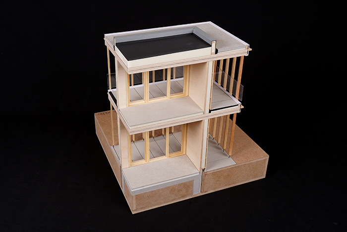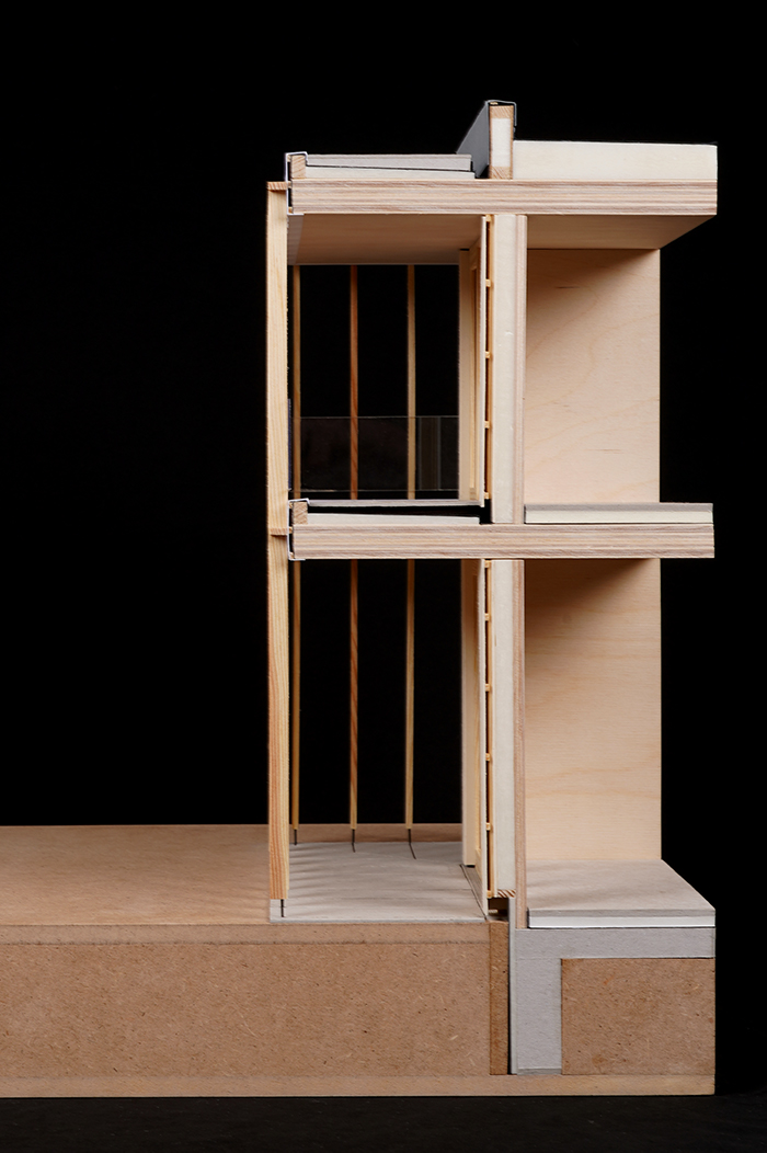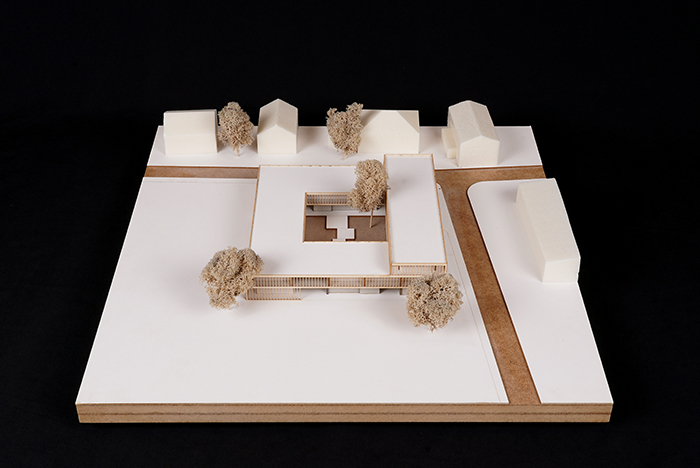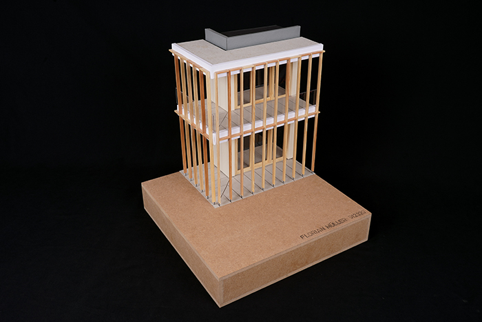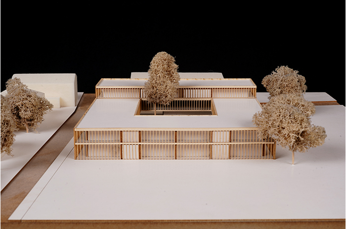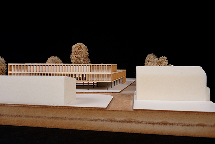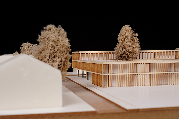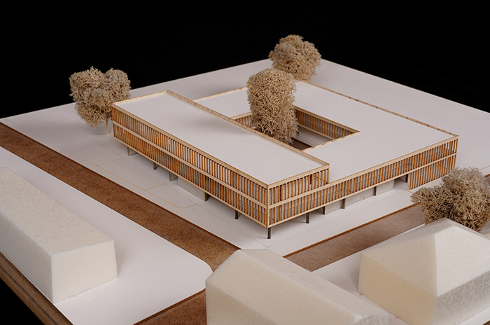 In der kleinen rheinhessischen Gemeinde Heidenfahrt soll im Sinne einer Verdichtung nach Innen noch landwirtschaftlich genutzte Fläche für ein gemeinschaftliches und generationsübergreifendes Wohnkonzept genutzt werden. Zudem sollen gemeinschaftliche Einrichtungen einen zusätzlichen Mehrwert für die Gemeinde schaffen. Die ebene Fläche von 50 x 45 m befindet sich im Ortskern und soll den städtebaulichen Kontext aus einer überwiegend zwei- bis dreigeschossigen Solitärstruktur (Einfamilienhäuser) aufgreifen. Entwickelt wurde ein Baukörper, der die starke Orientierung nach innen behält und gleichzeitig auf die städtebaulichen Kanten von Heidenfahrt reagiert – ein quadratischer Rahmen, der einen Innenhof umschließt. Das Gebäude ist offen gestaltet, dabei gibt ihm die vertikale Fassade aus Holz eine räumliche Hülle und vermittelt Ruhe und Klarheit. Der Blickwinkel entscheidet, ob das Gebäude geschlossener oder transparenter wirkt. Aufenthaltscharakter und Begegnungsfläche schafft ein heller, begrünter Innenhof. Er bildet die Brücke zwischen dem öffentlichen und dem halböffentlichen Raum des Quartiers. Die Geschossdecken ragen beidseitig aus dem Baukörper heraus und ergeben so private Balkonzonen nach außen und einen gemeinschaftlichen Laubengang für Erschließung und Kommunikation nach innen. Gemeinschaftliche Einrichtungen wie Café, Kita und Verwaltung befinden sich barrierefrei im Erdgeschoss. Alle Wohnungen sind nach Süden und Westen orientiert. Die Homeoffice-Einheiten und die Gästezimmer befinden sich an der Ostseite. Der Entwurf besteht aus in Holz horizontal geschaltem Beton im Erdgeschoss und Holzbauweise in den oberen Geschossen.